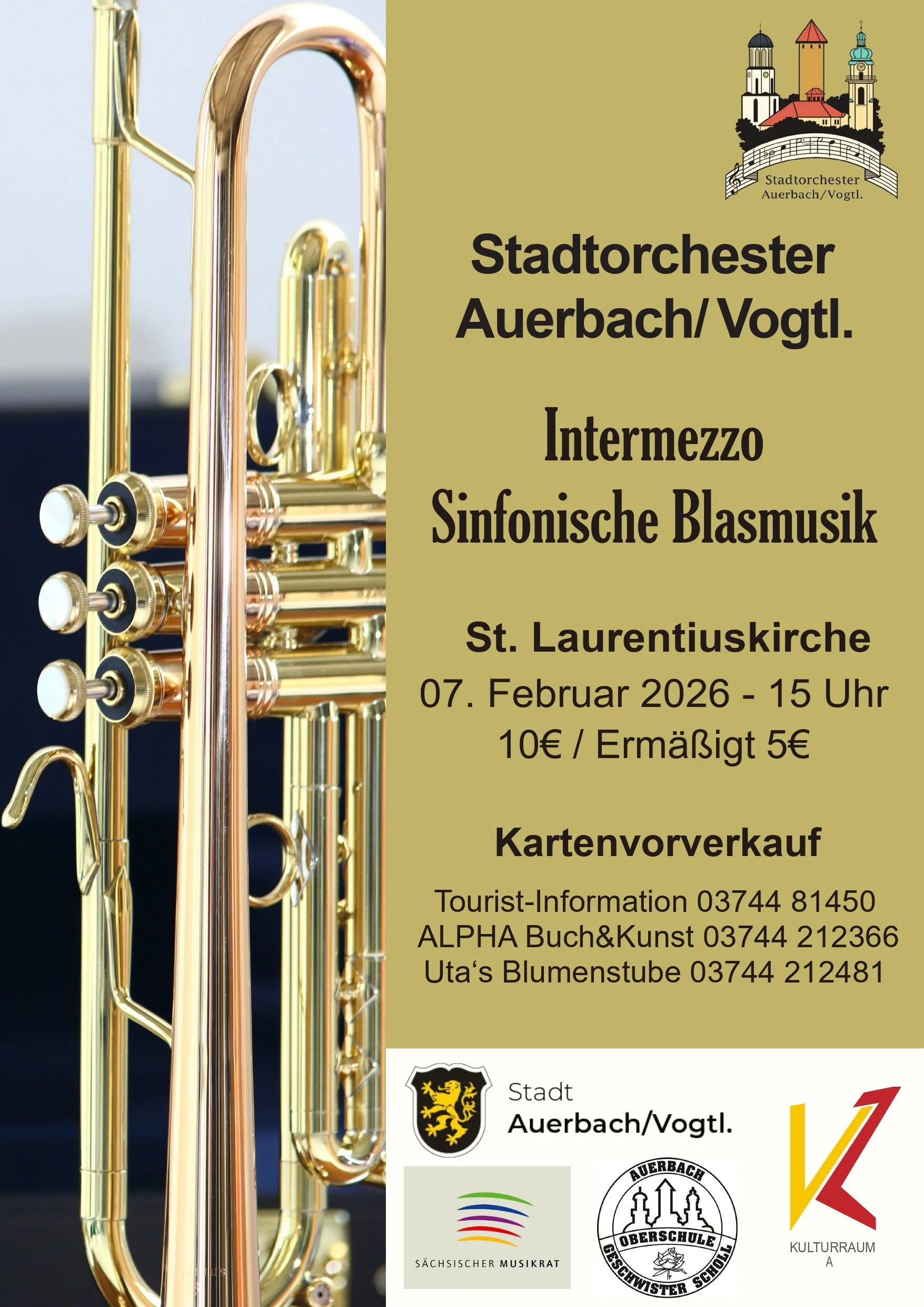 Freuen Sie sich auf unser Neujahrskonzert 2026 unter dem Motto “Sinfonische Blasmusik”! Tickets gibt es ab dem u.a. in der Tourist-Information in Auerbach (03744 81450) sowie vor Ort am Einlass.